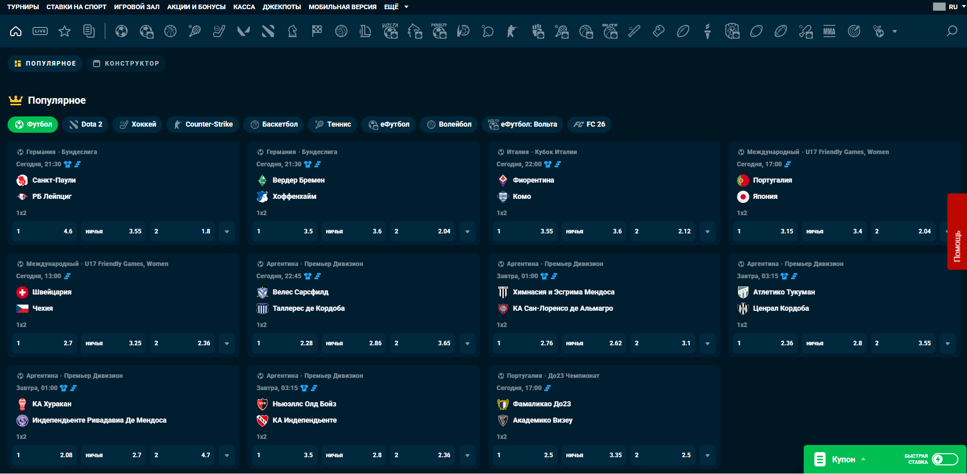 Главные экраны, горячие матчи, виджеты турниров и где открывается купон